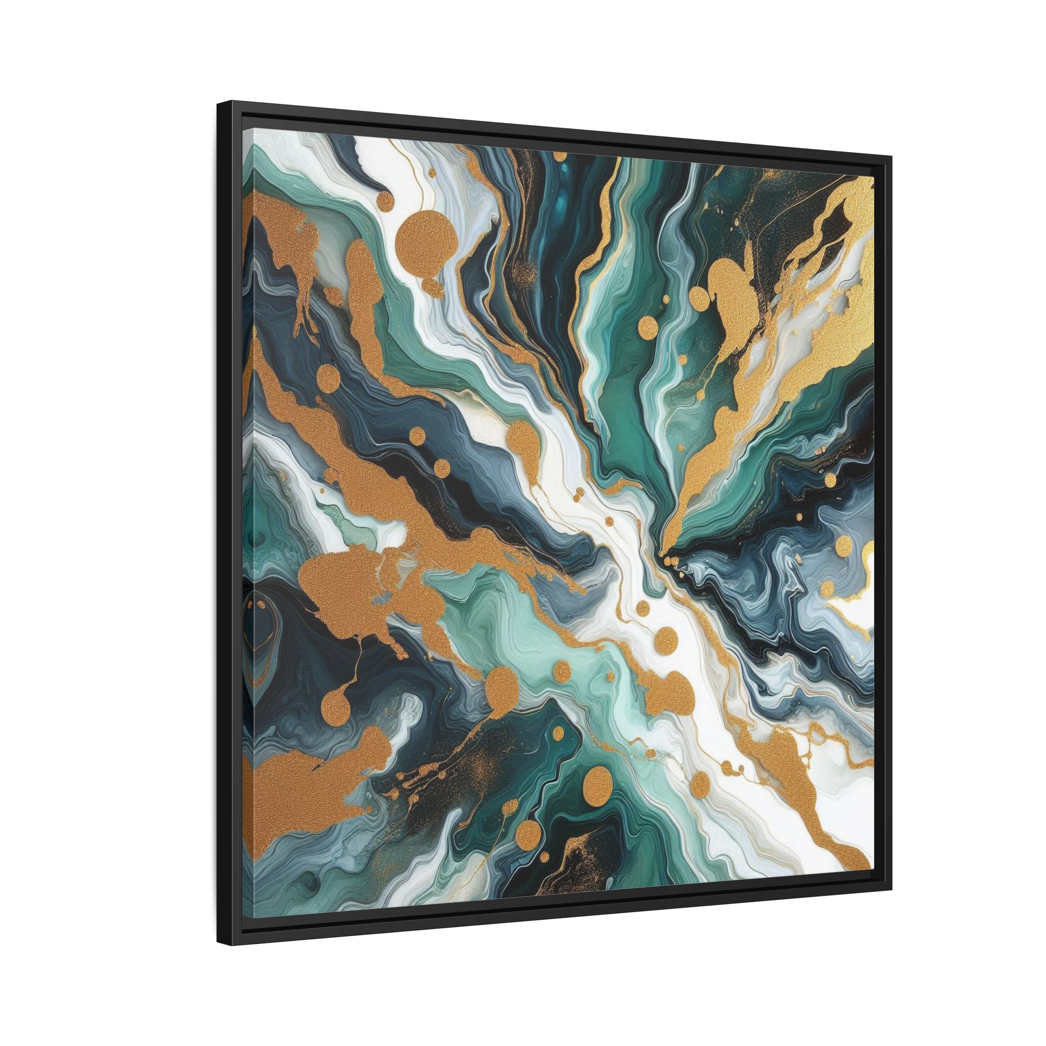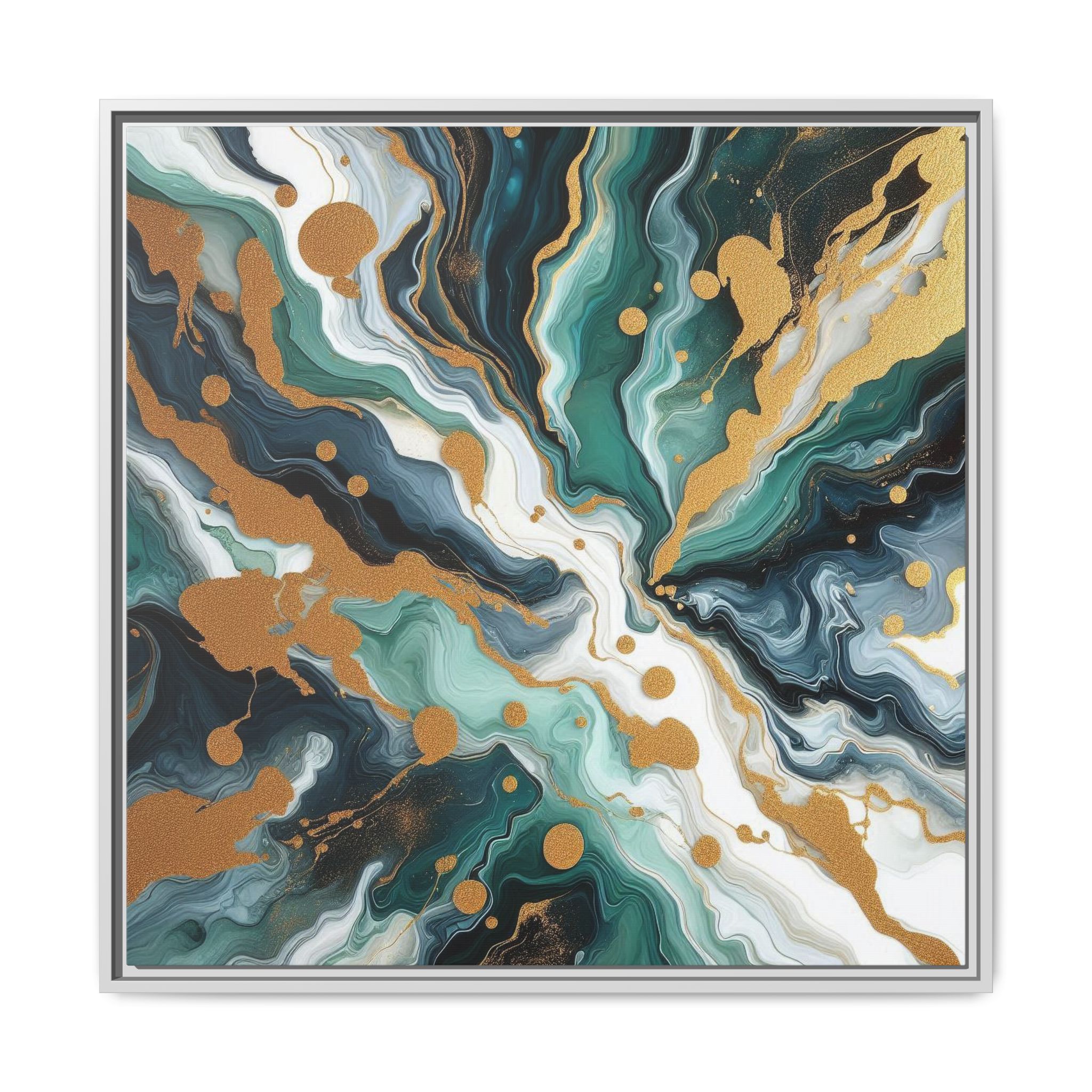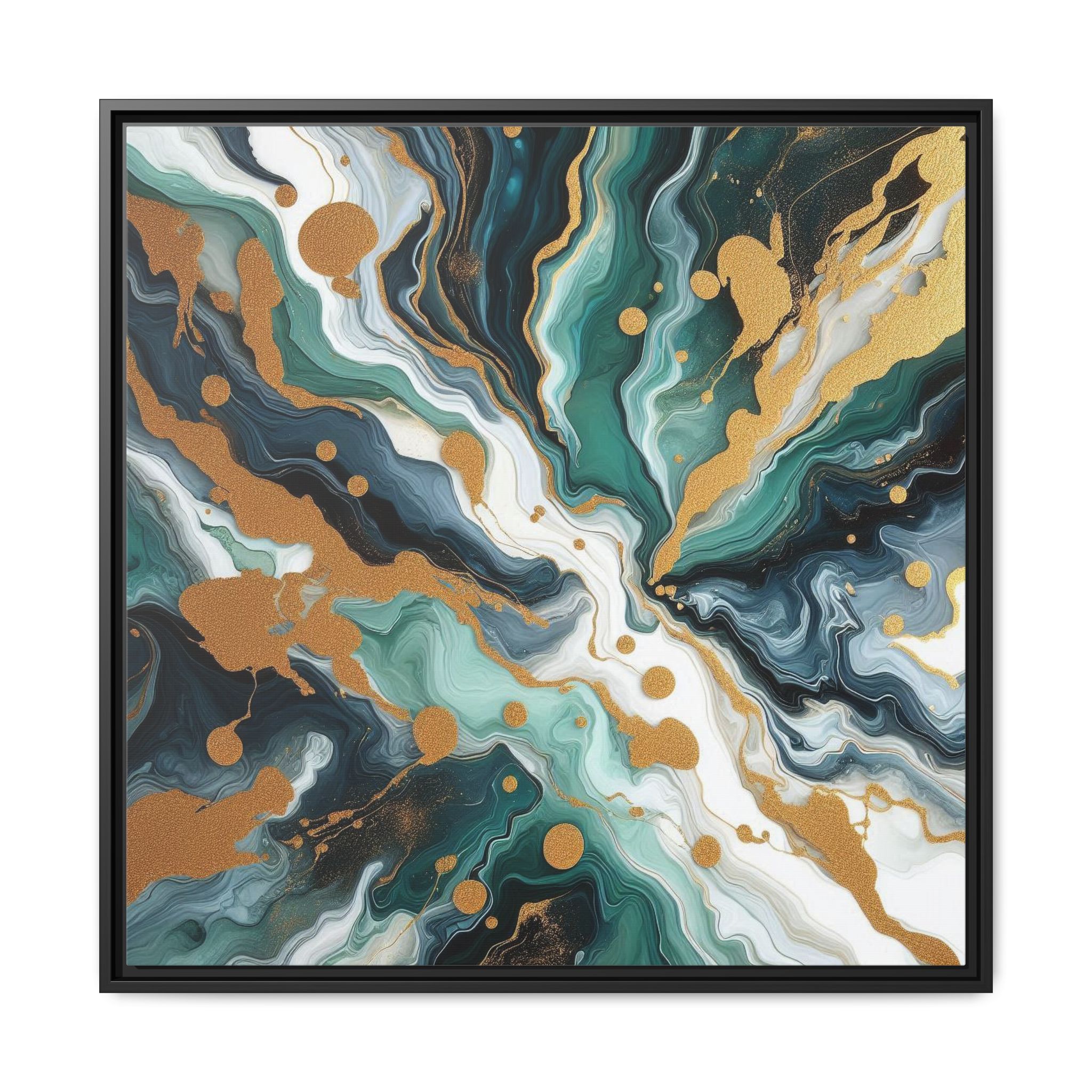 Two powerful currents collide in a chaotic yet harmonious nexus. Gold is scattered like celestial dust from the impact, splattering across swirling eddies of emerald, black, and seafoam green, creating a balanced and energetic composition.