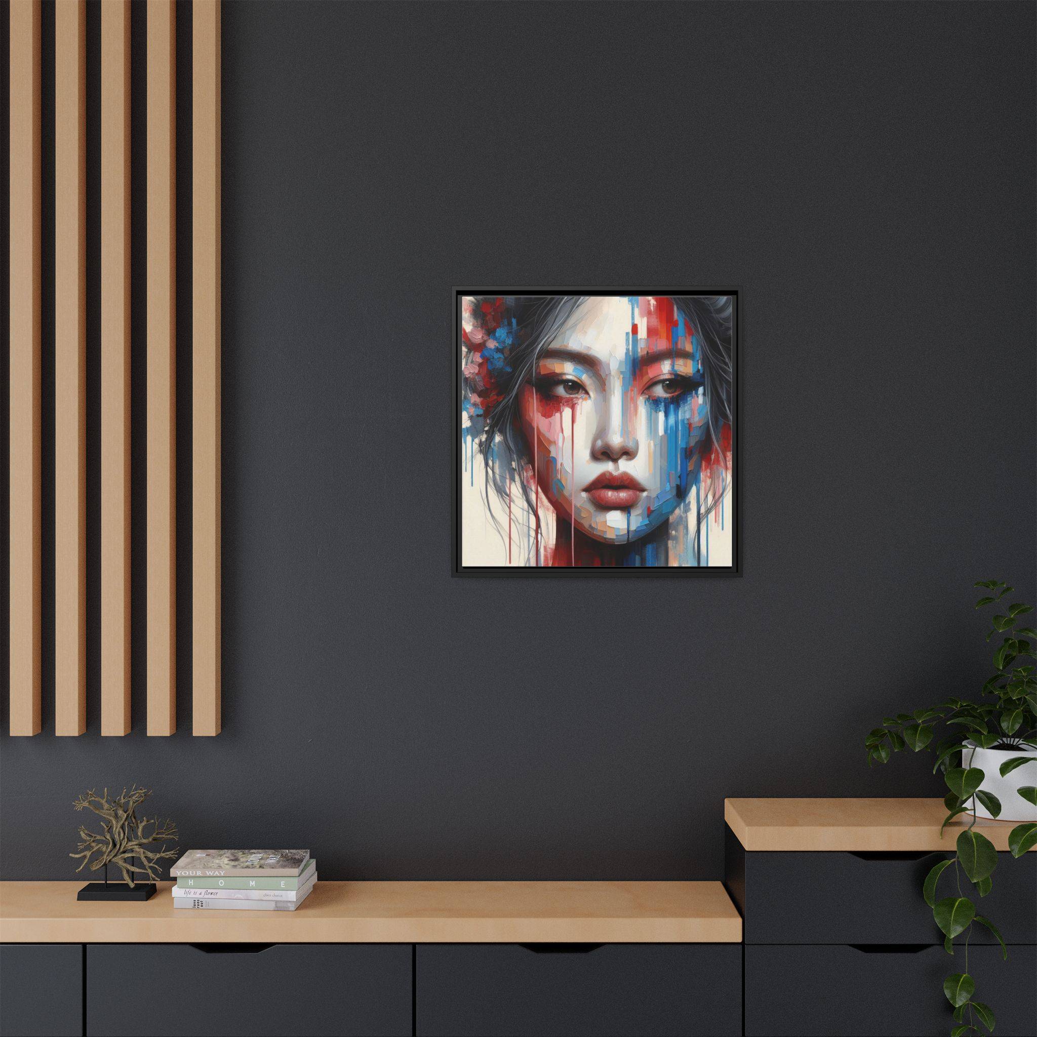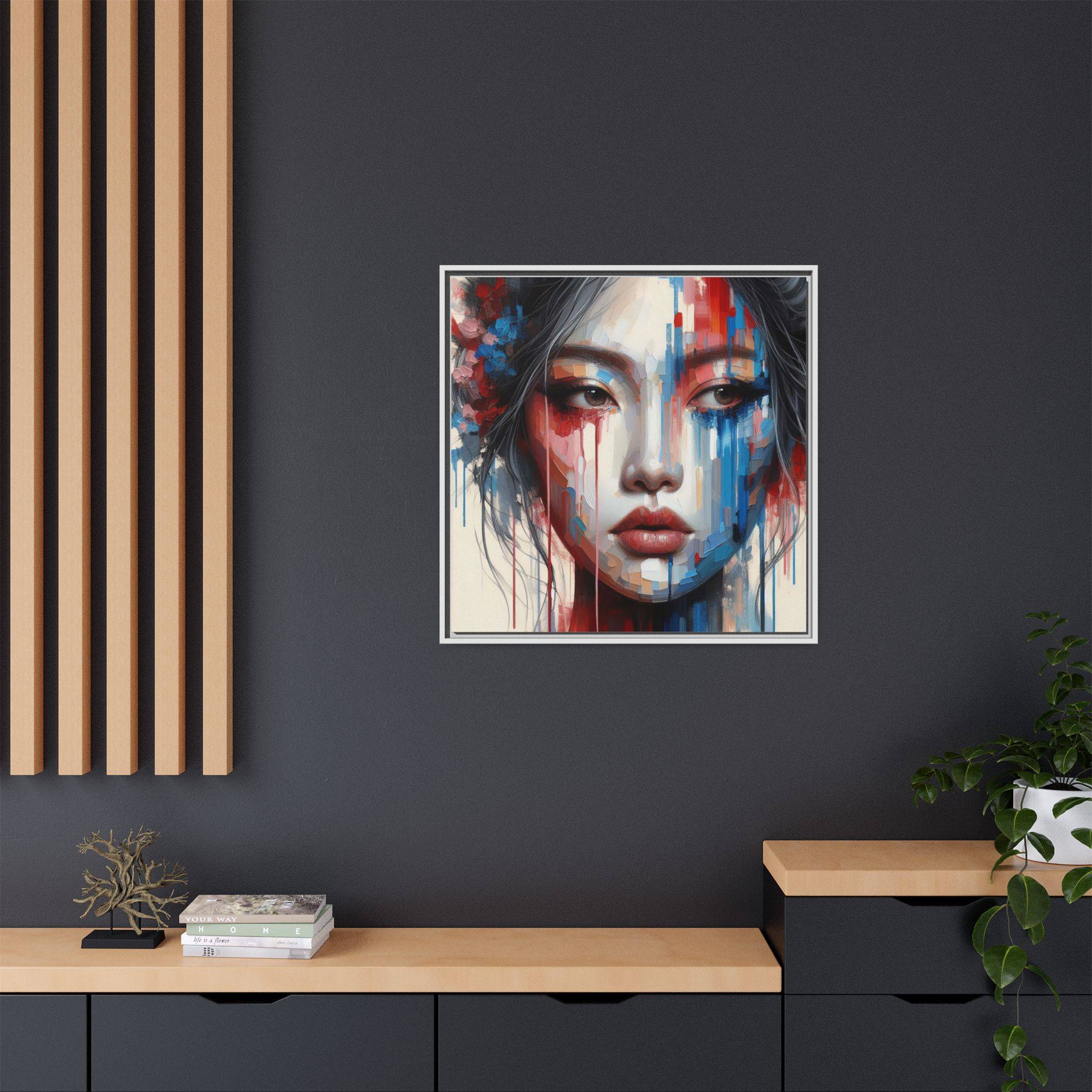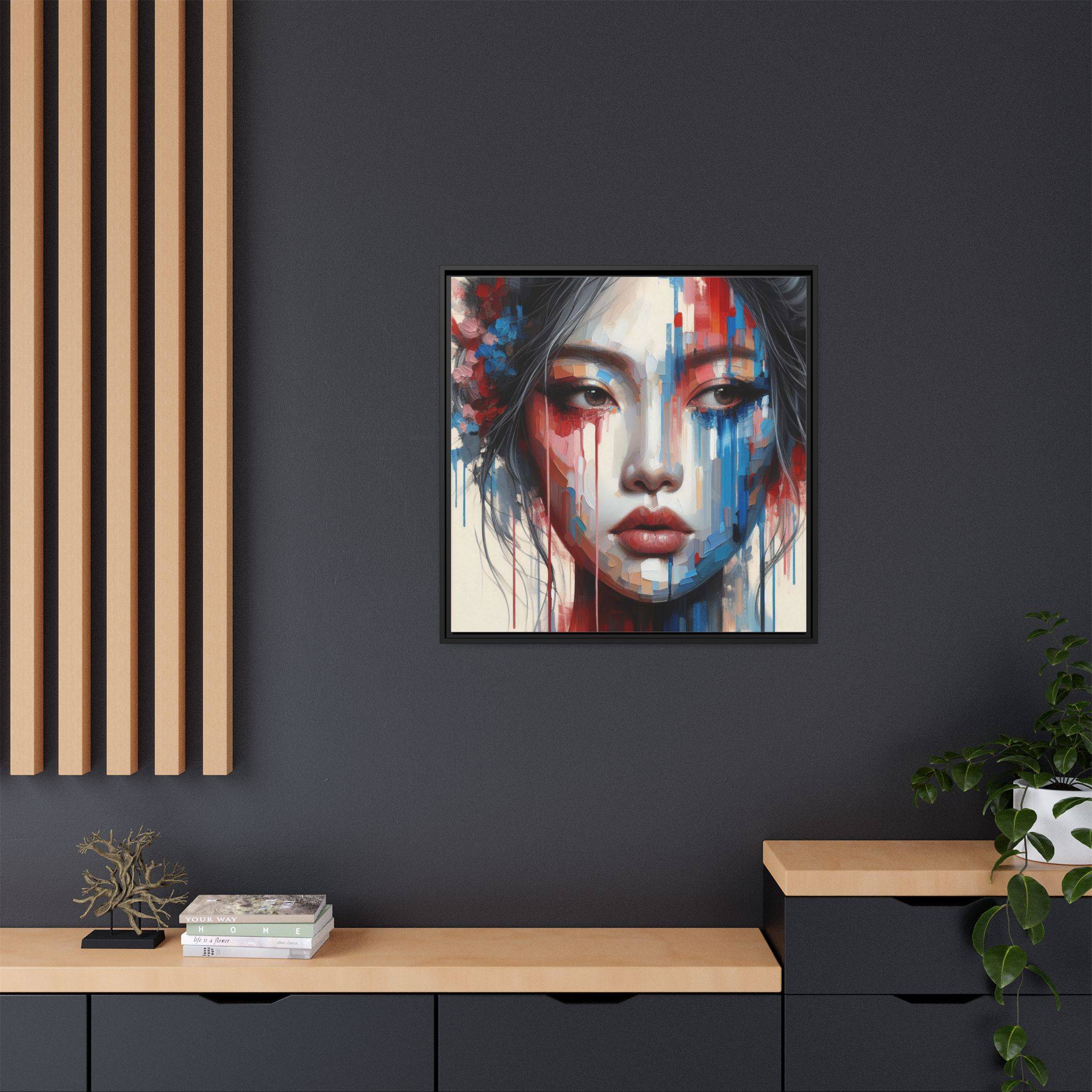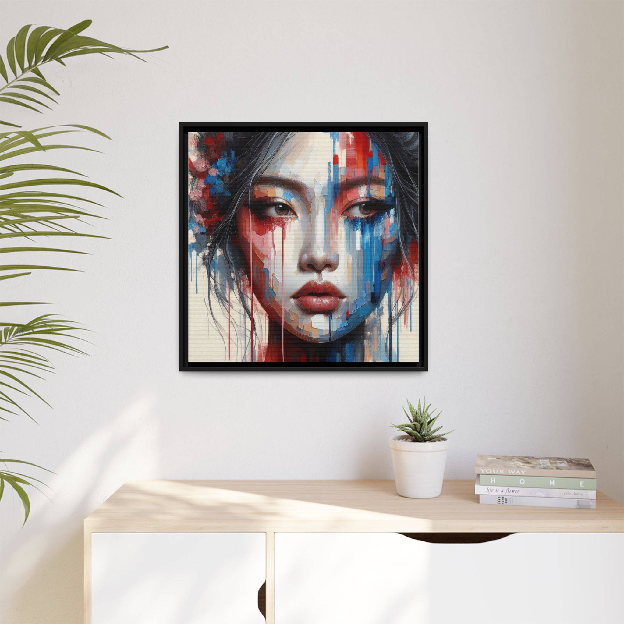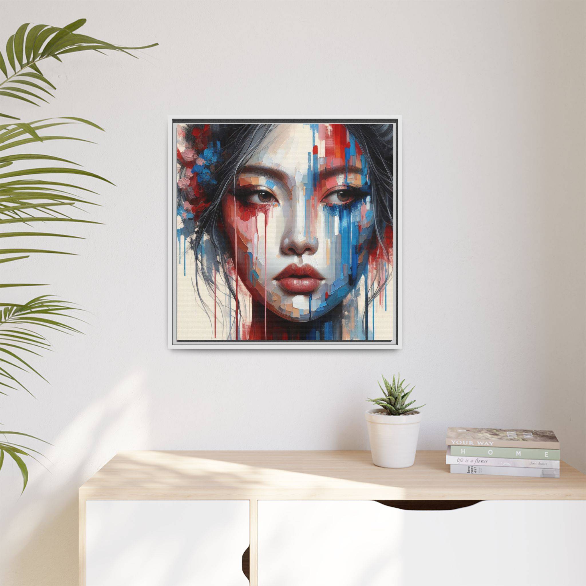 A framed matte canvas that brings bold, painterly emotion to your walls. Soft, muted skin tones and explosive streaks of red and blue create a modern portrait that holds the room’s attention without overpowering it. The fine-texture canvas with a subtle matte finish reduces glare and reveals nuanced brush-like details, while the slim pine frame adds structure and a contemporary gallery feel. Hang it in a living room, studio, or hallway to introduce depth and color that sparks conversation and quiet reflection.