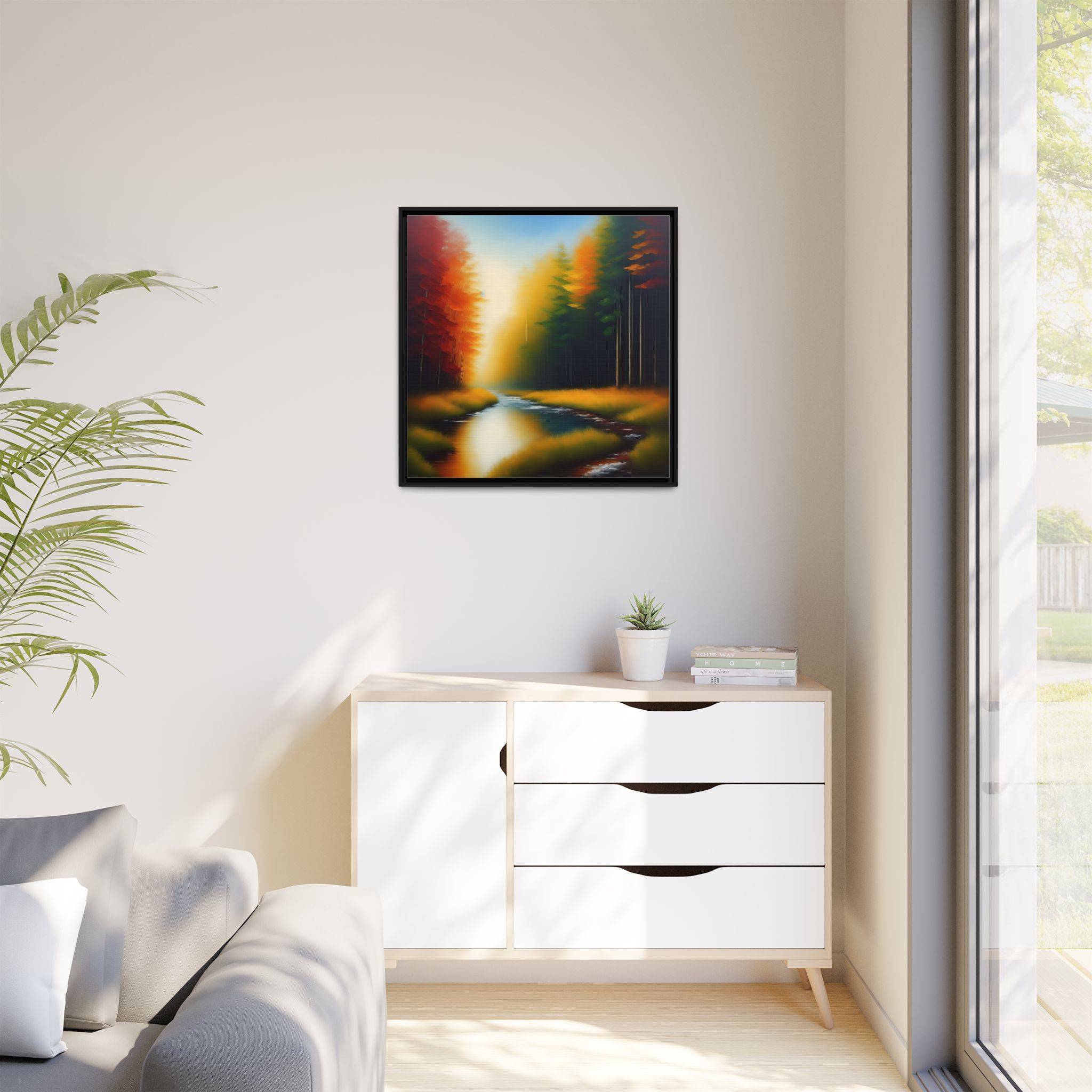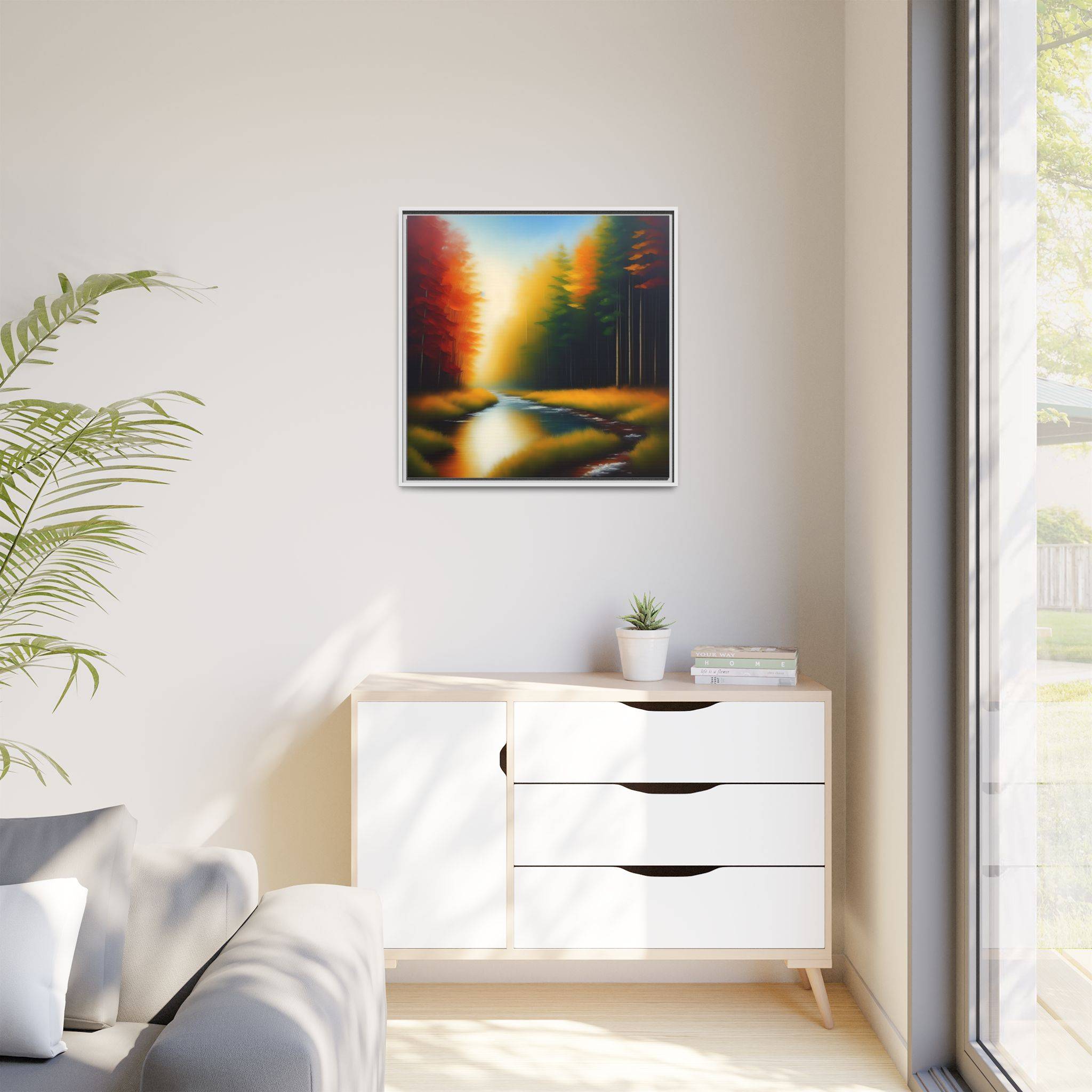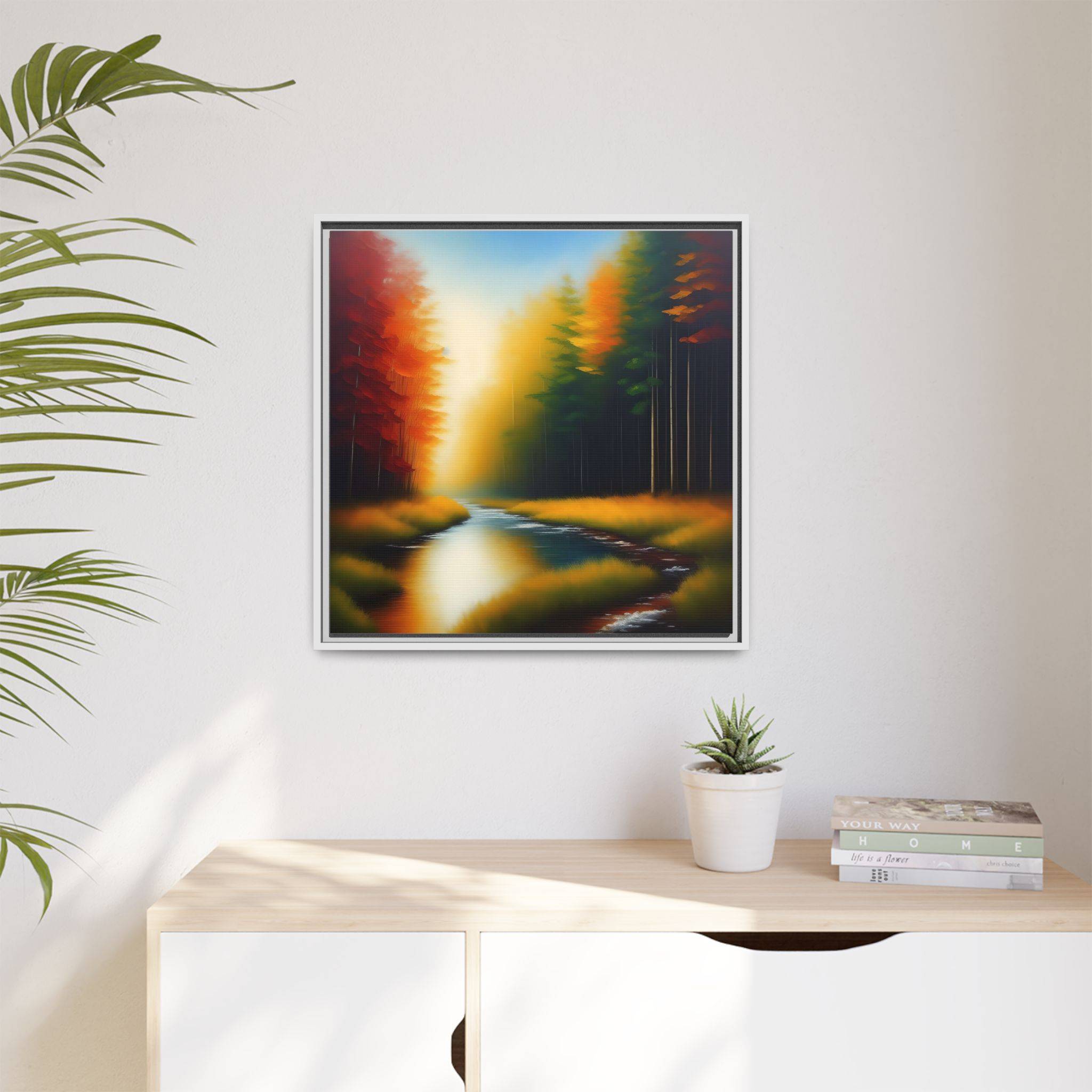 Transform your living space with our exquisite framed matte canvas. Featuring a stunning landscape with vibrant colors, this art piece brings a touch of nature’s serenity into your home. The calming blues of the water juxtaposed with warm autumn tones create a warm and inviting atmosphere. Perfect for any room, it effortlessly enhances your decor, making it ideal for living rooms, bedrooms, or even office spaces. This framed canvas appeals to art lovers who appreciate high-quality prints and unique designs. It’s a wonderful choice for housewarmings, birthdays, or seasonal decorations, especially during the fall where its colors resonate with the season’s beauty.