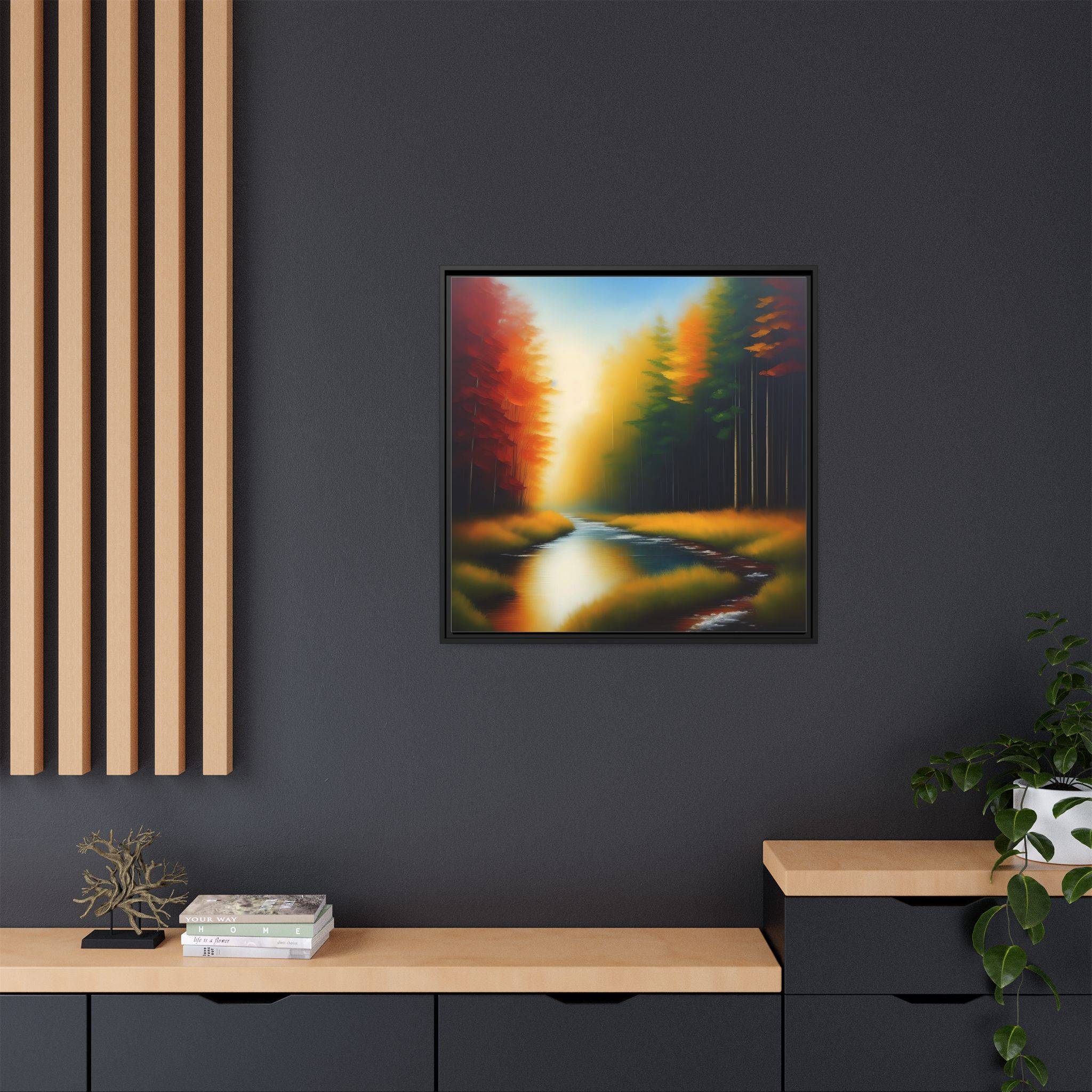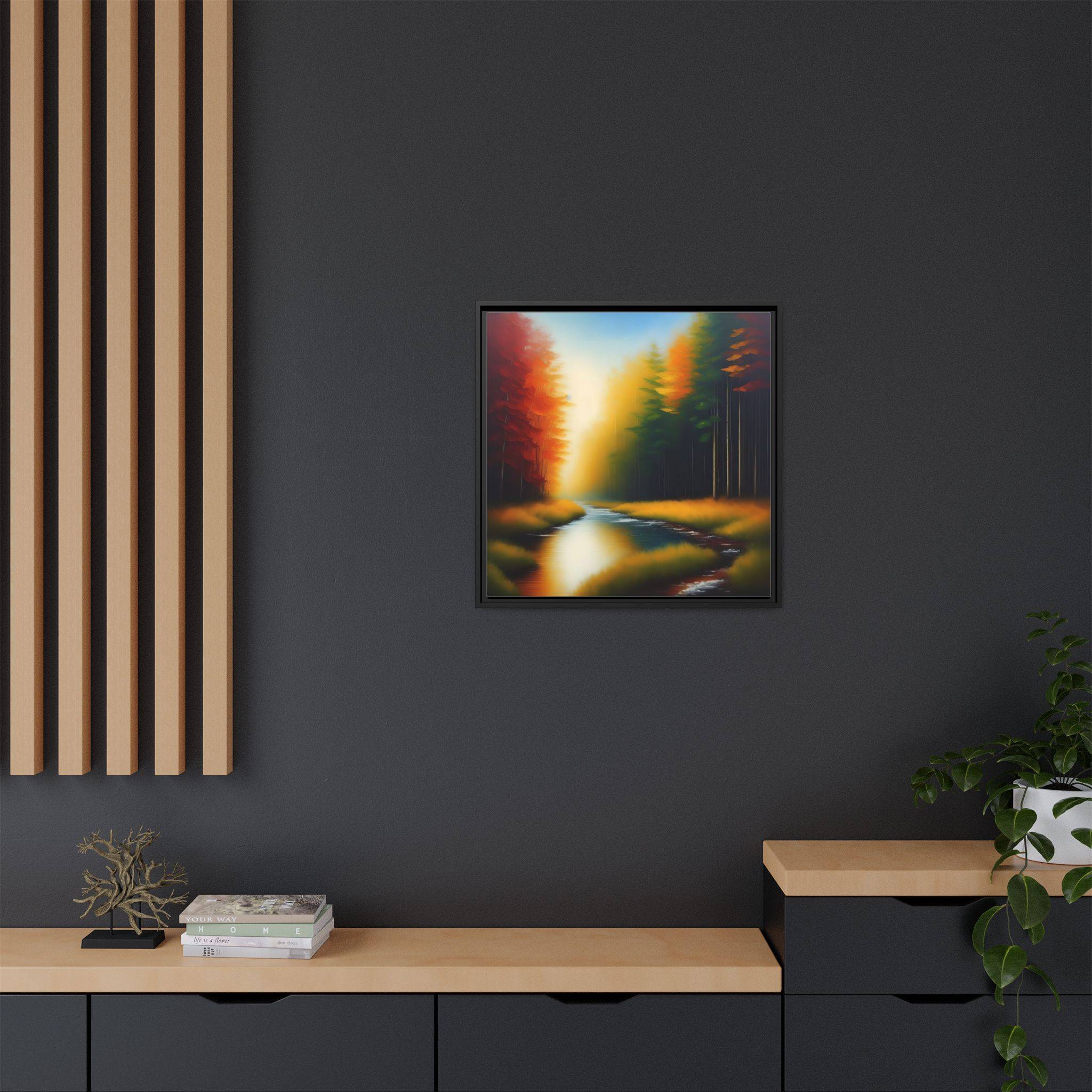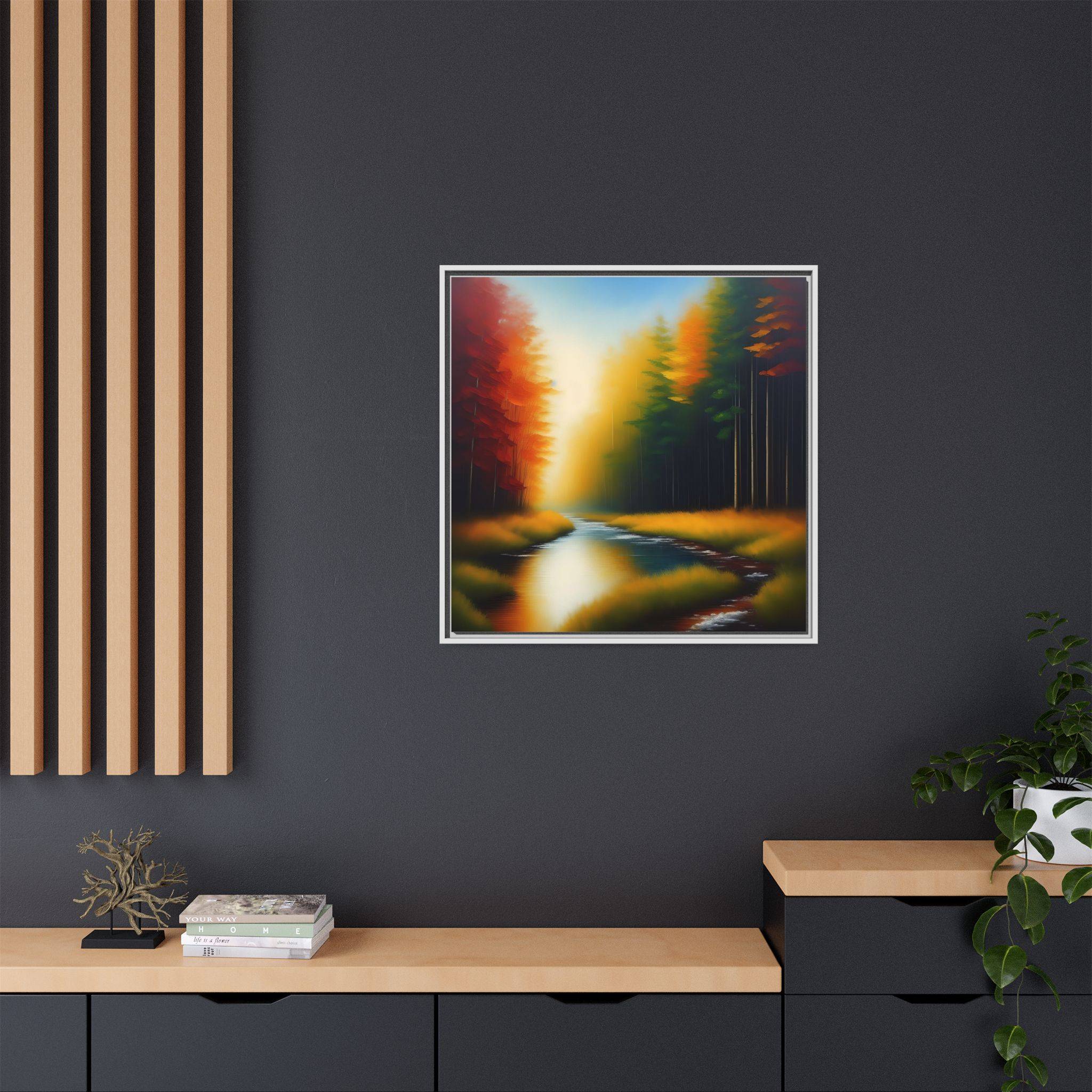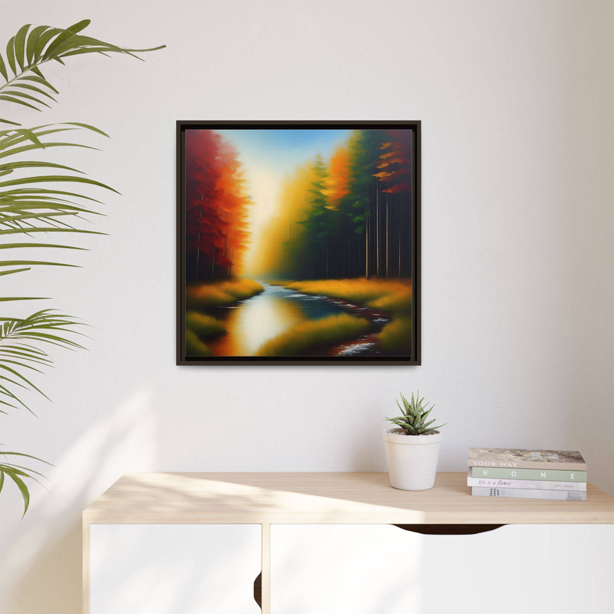 Transform your living space with our exquisite framed matte canvas. Featuring a stunning landscape with vibrant colors, this art piece brings a touch of nature’s serenity into your home. The calming blues of the water juxtaposed with warm autumn tones create a warm and inviting atmosphere. Perfect for any room, it effortlessly enhances your decor, making it ideal for living rooms, bedrooms, or even office spaces. This framed canvas appeals to art lovers who appreciate high-quality prints and unique designs. It’s a wonderful choice for housewarmings, birthdays, or seasonal decorations, especially during the fall where its colors resonate with the season’s beauty.