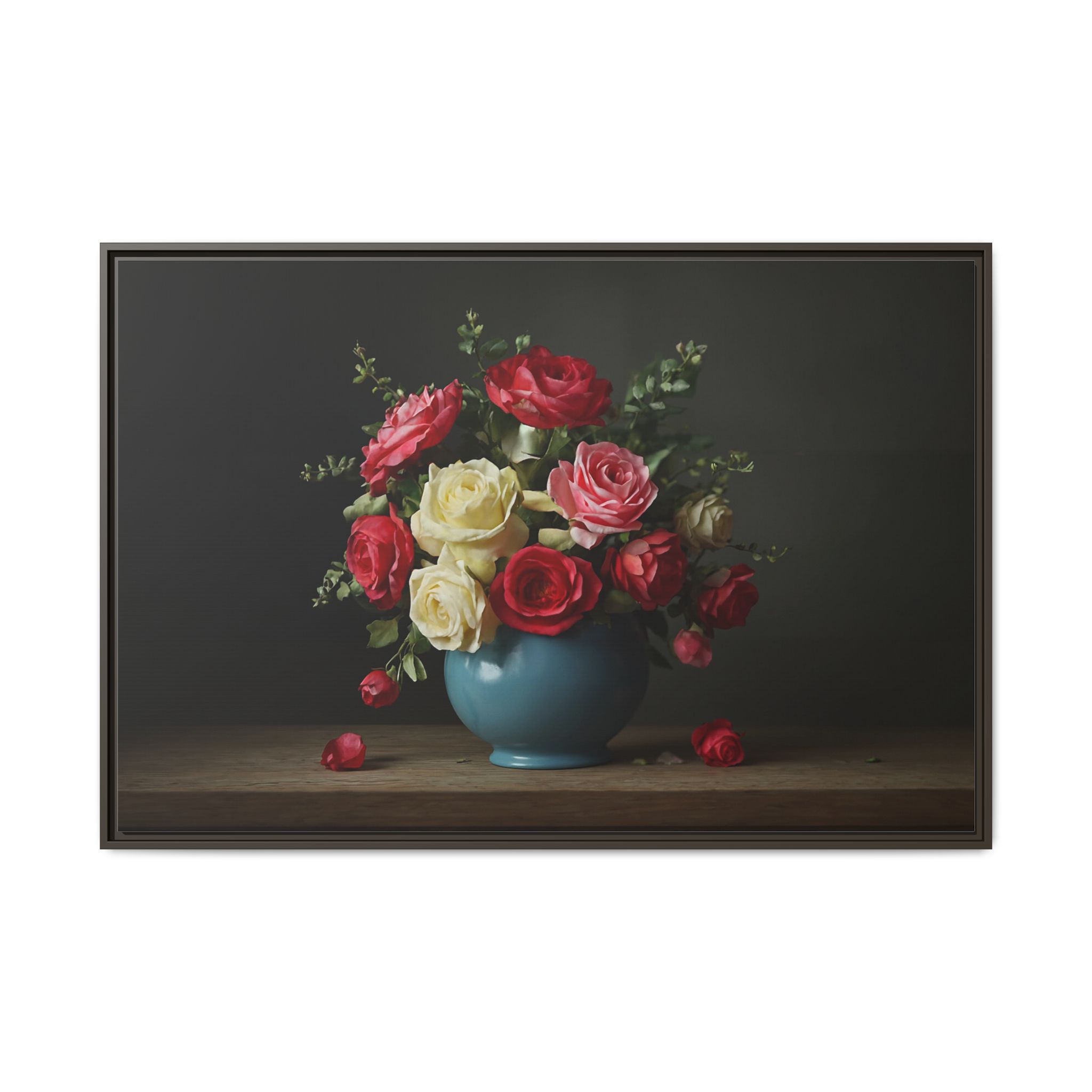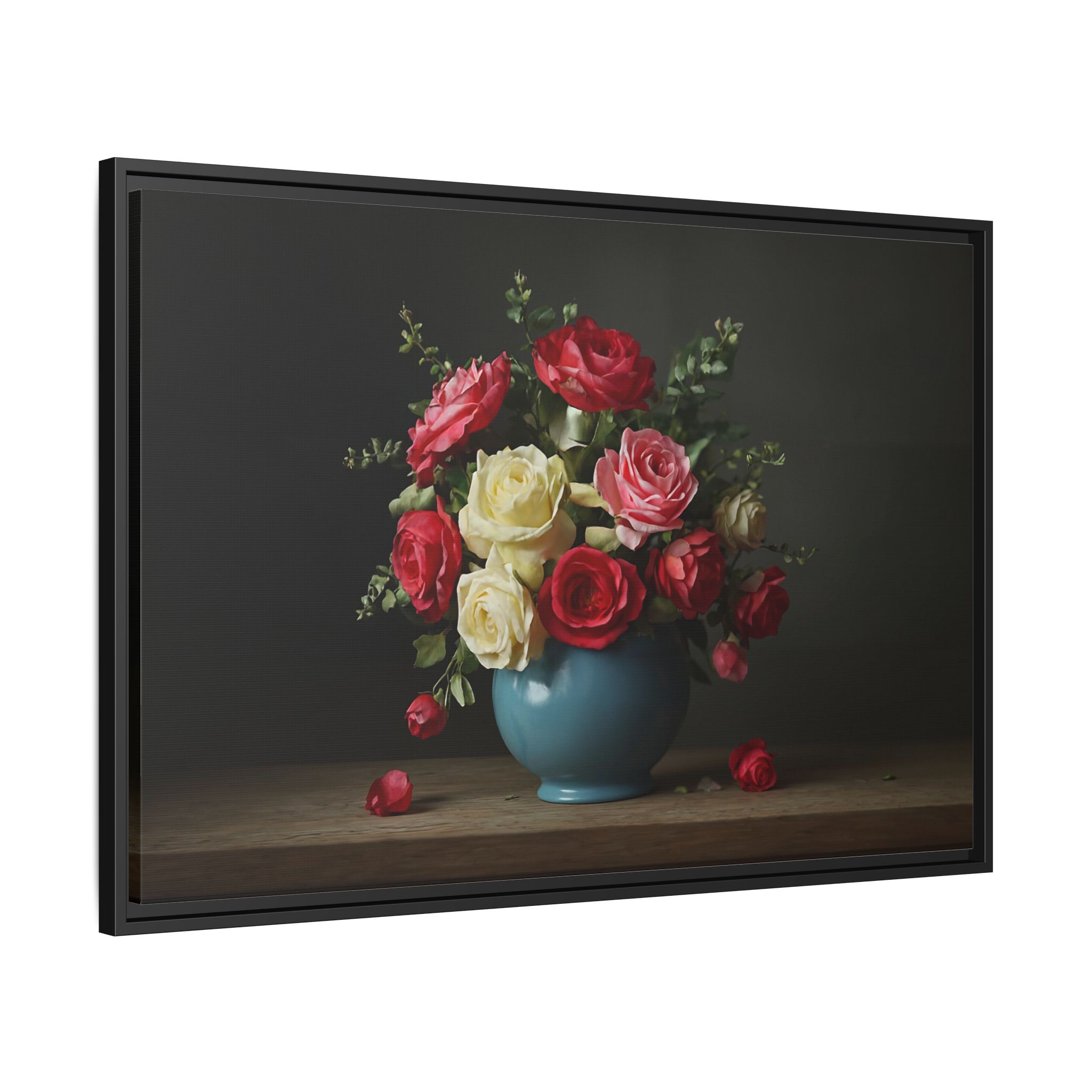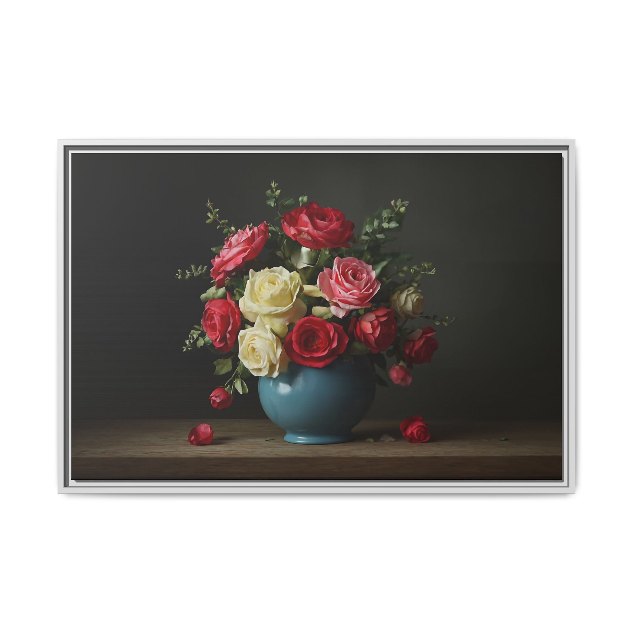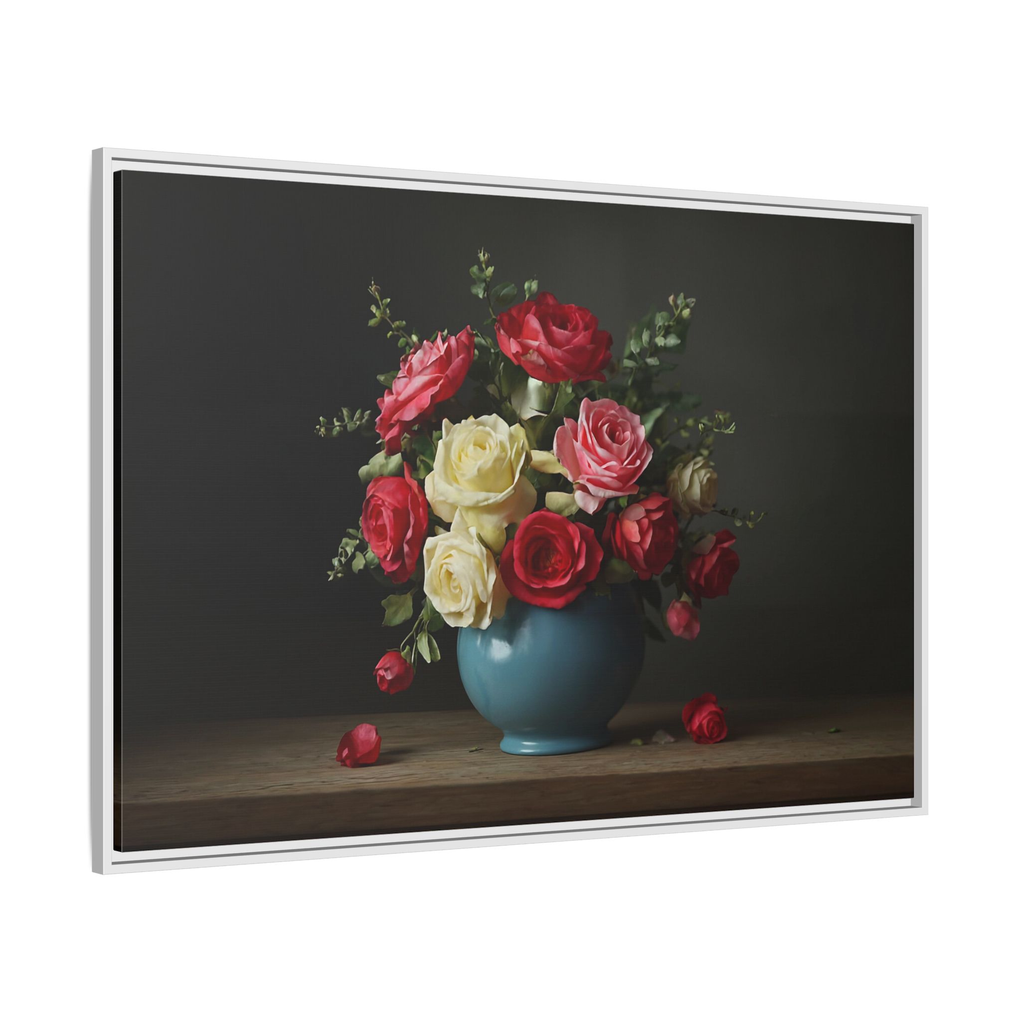 Evoking the spirit of the Dutch Golden Age, “The Delft Bouquet” is a masterpiece of classic floral art. A lush arrangement of red, yellow, and blush roses bursts forth from a rustic blue ceramic vase. The masterful play of light and shadow gives each petal a velvety, lifelike texture, while fallen blooms on the wooden table add a touch of romantic melancholy. This is a timeless piece, rich in history and emotion.